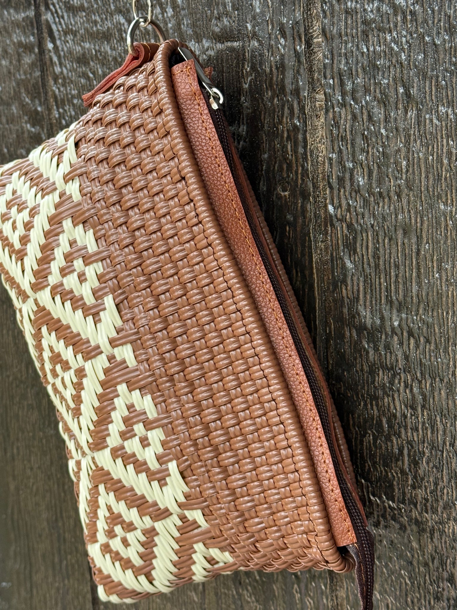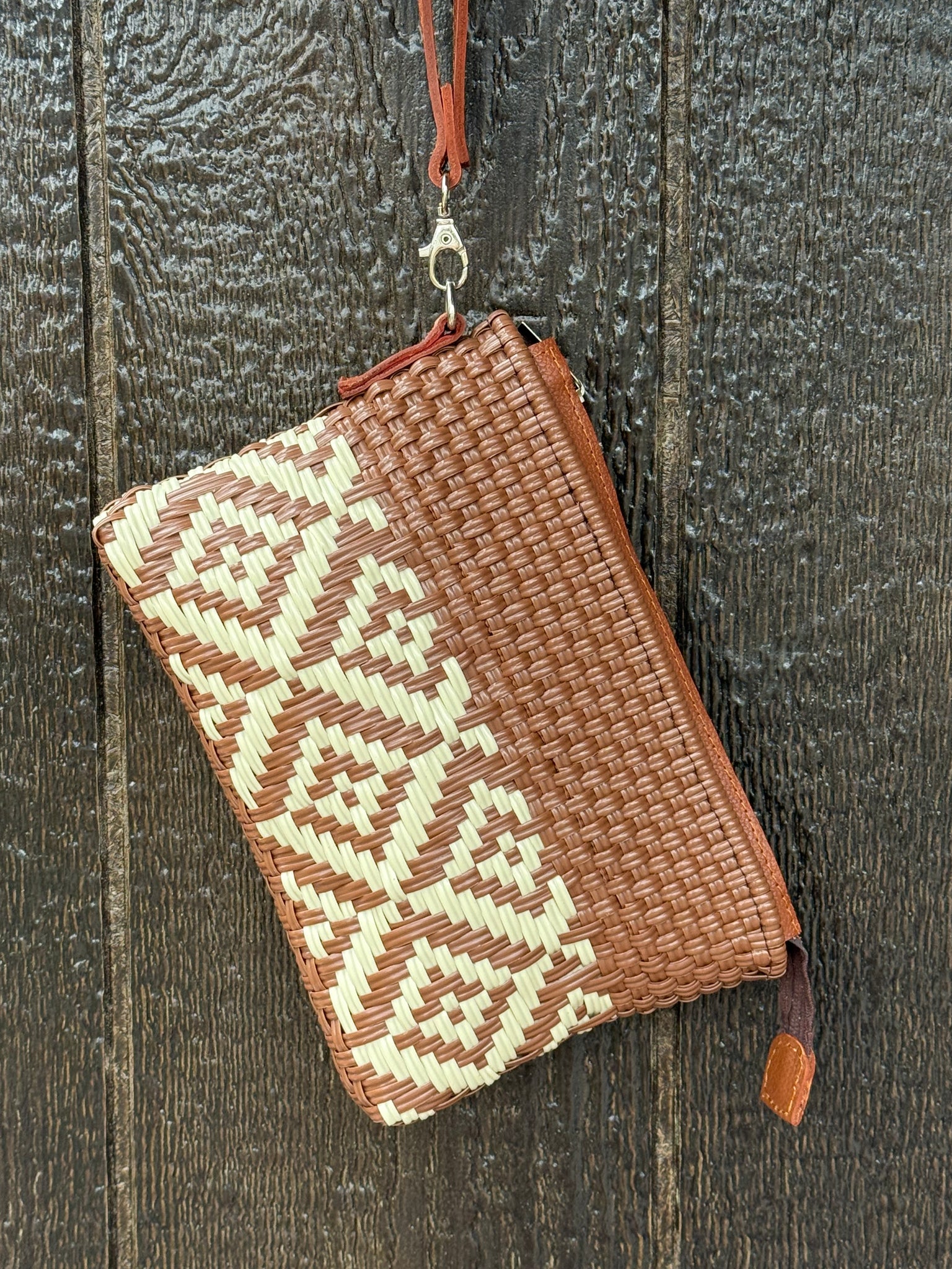 Washable and durable plastic woven clutch bag.