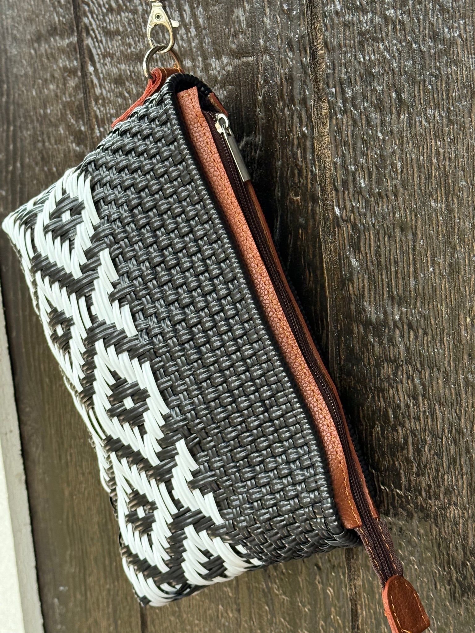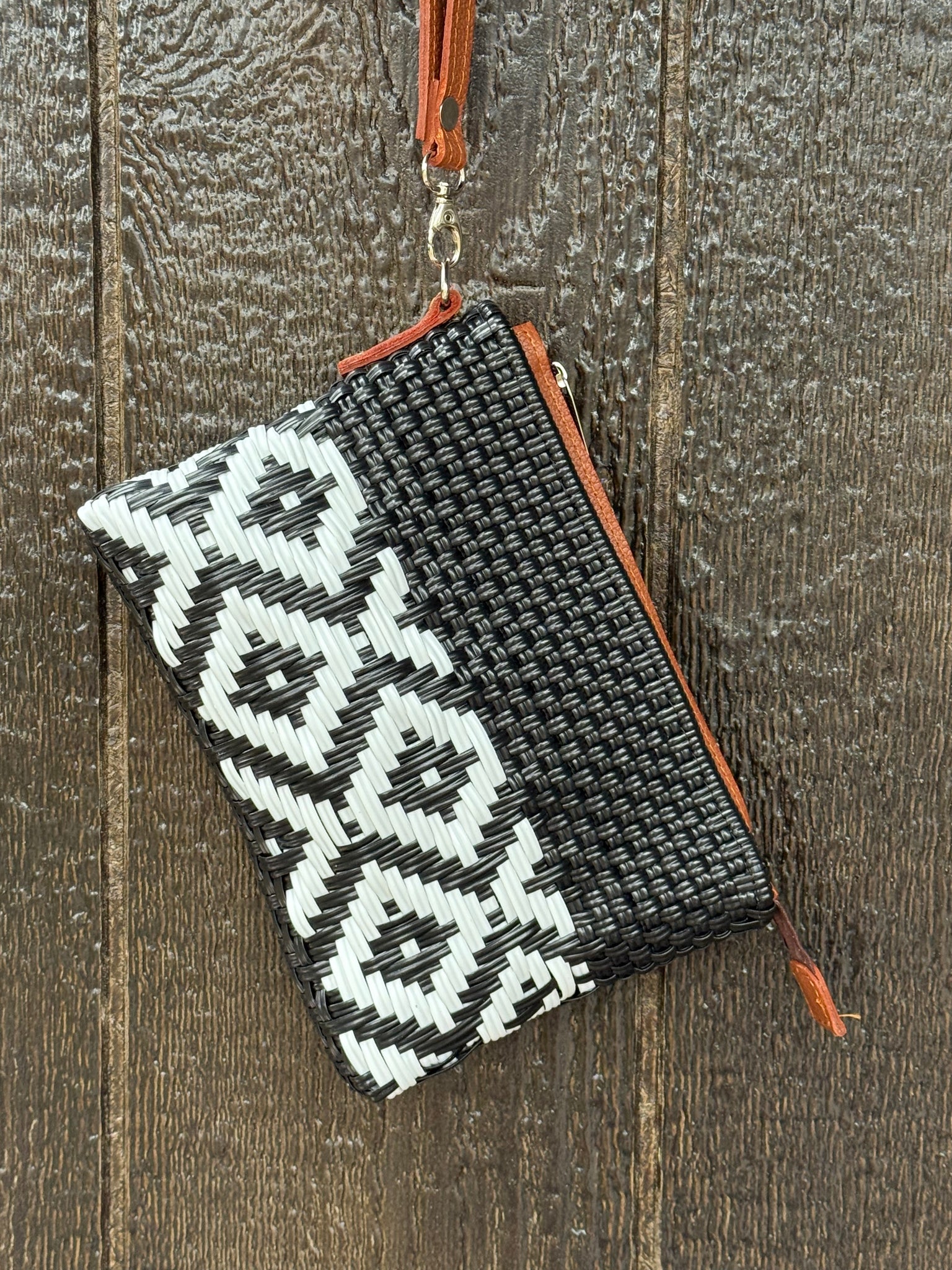Washable and durable plastic woven clutch bag.
