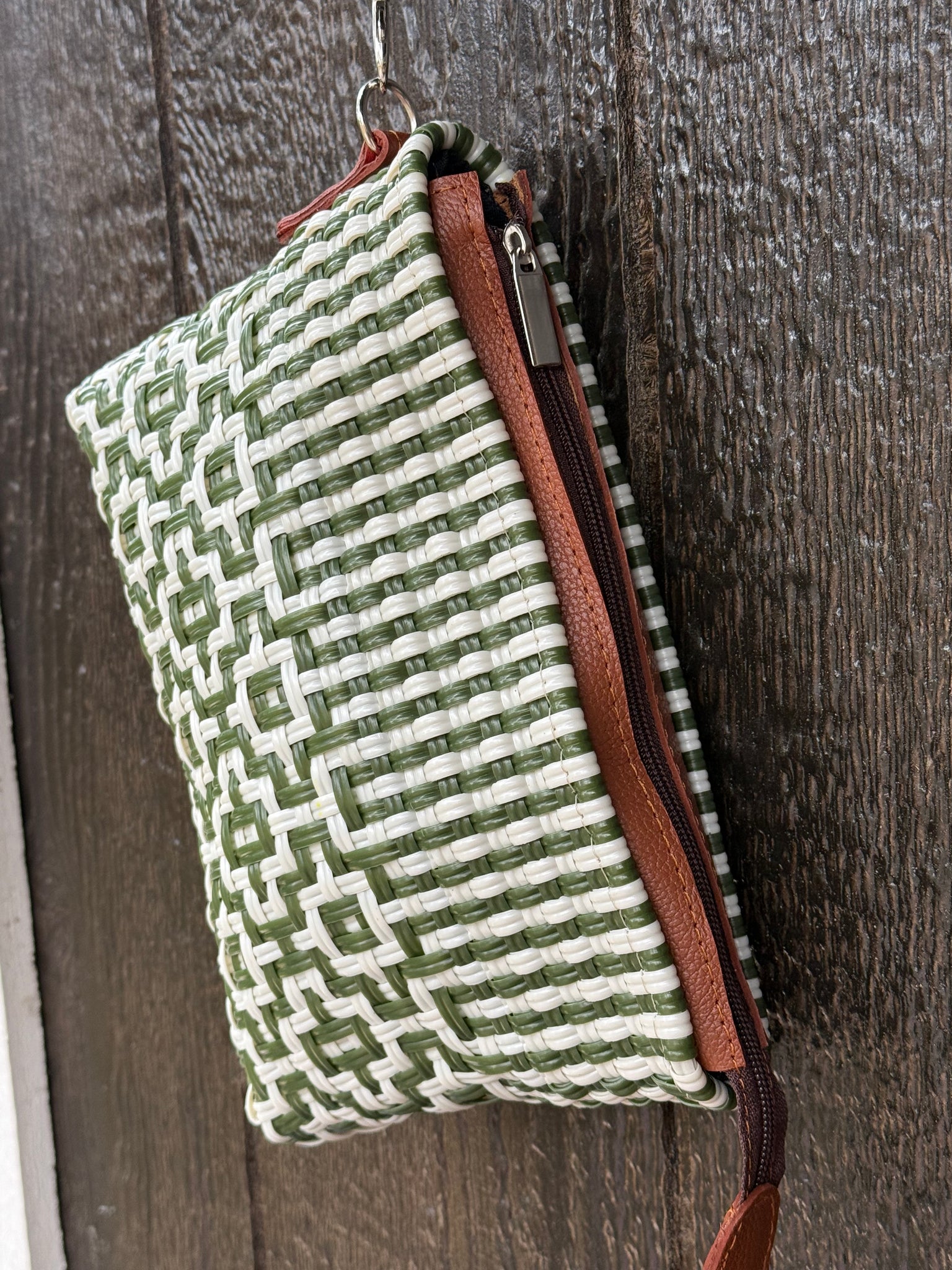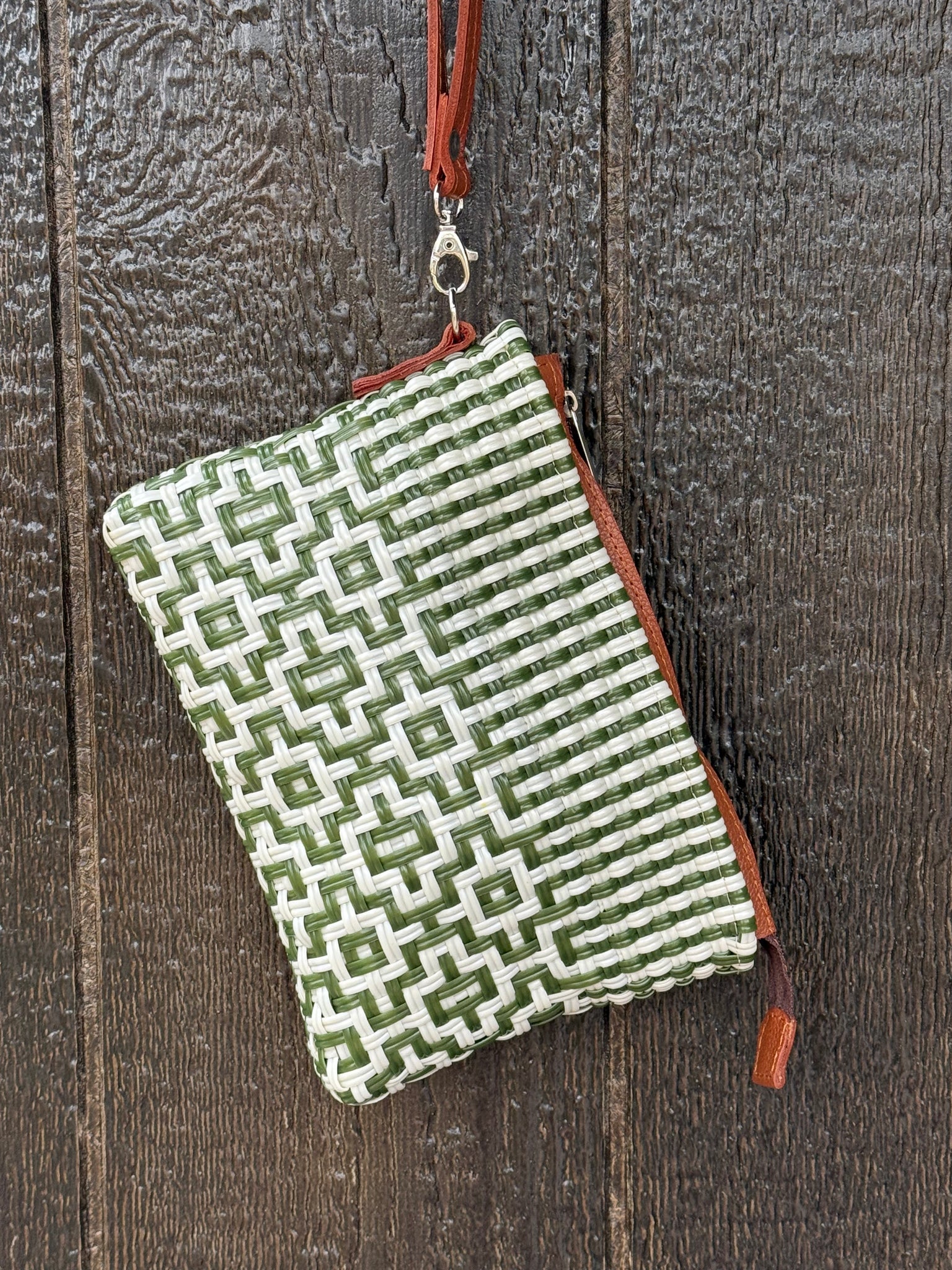 Washable and durable plastic woven clutch bag.